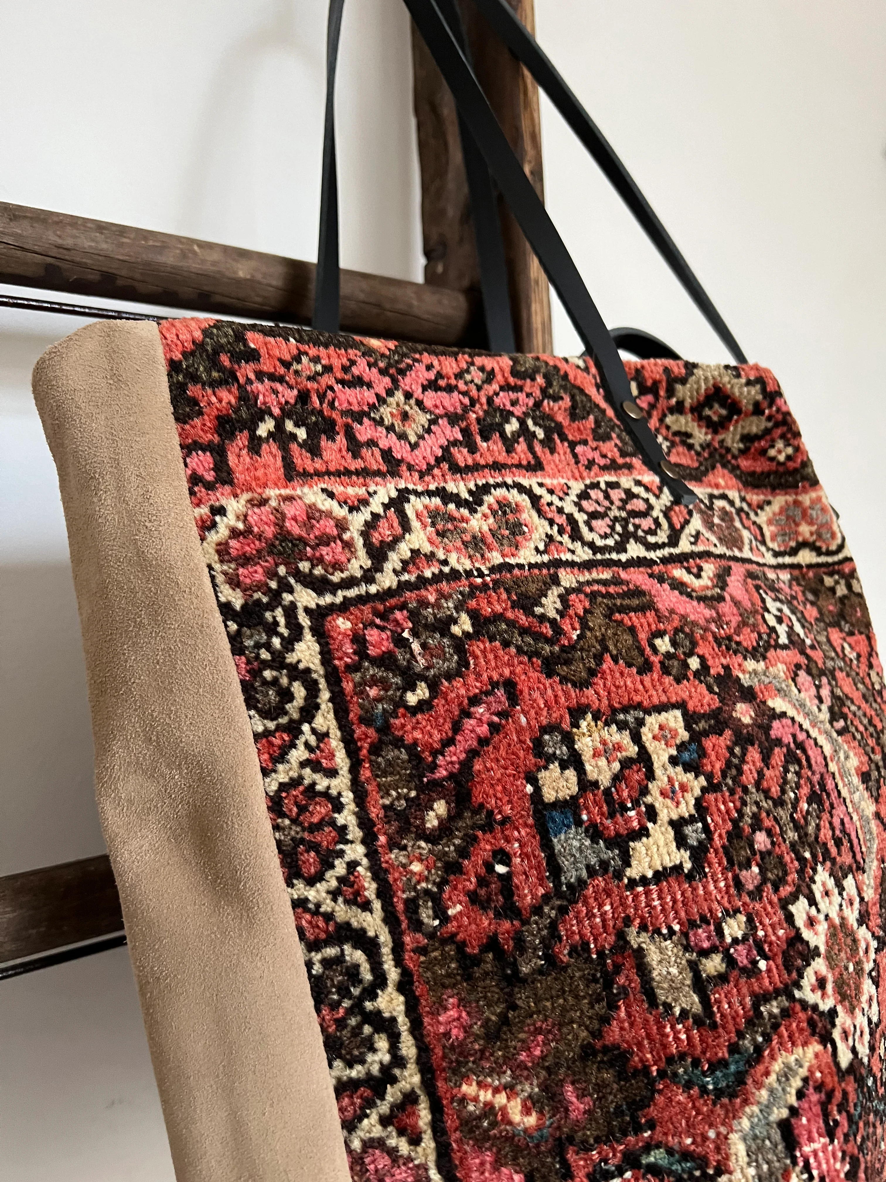 Meet the Brownber Hall bag, the prettiest everyday tote you'll ever see. The front is a Mahal rug circa 1900, the back is camel suede leather. Each bag is fully lined in cotton and comes in a bespoke linen bag (we love using ours for laundry).
