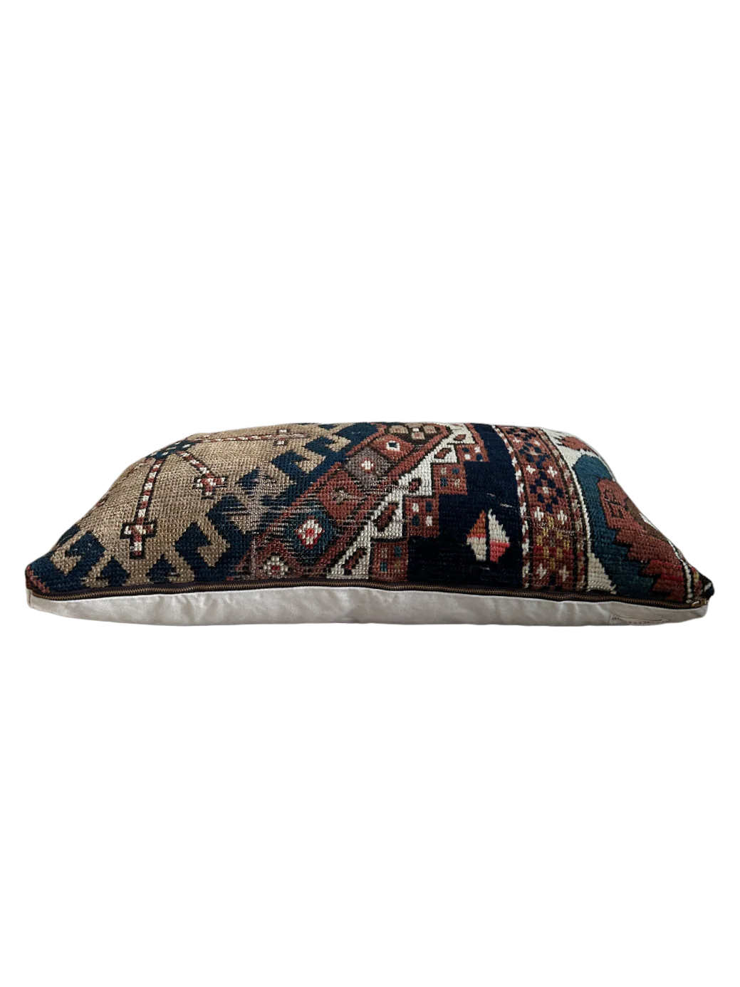 This pillow pairs a handwoven rug fragment with pure cotton canvas for a textured, timeless feel. It’s finished with a sturdy unlacquered brass zipper.