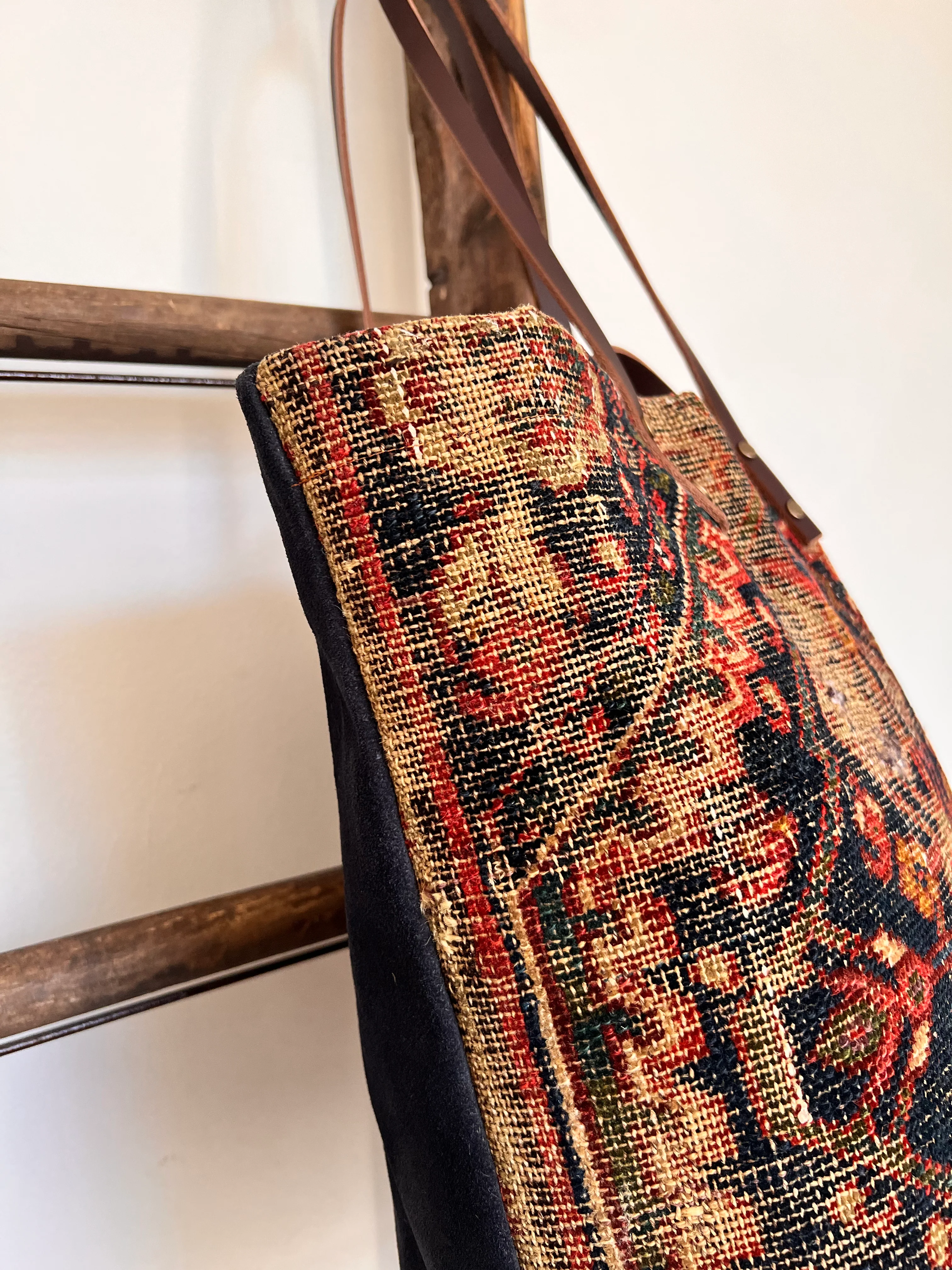 The front is a Malayer rug circa 1900, the back is navy suede leather. Each bag is fully lined in cotton and comes in a bespoke linen bag (we love using ours for laundry).